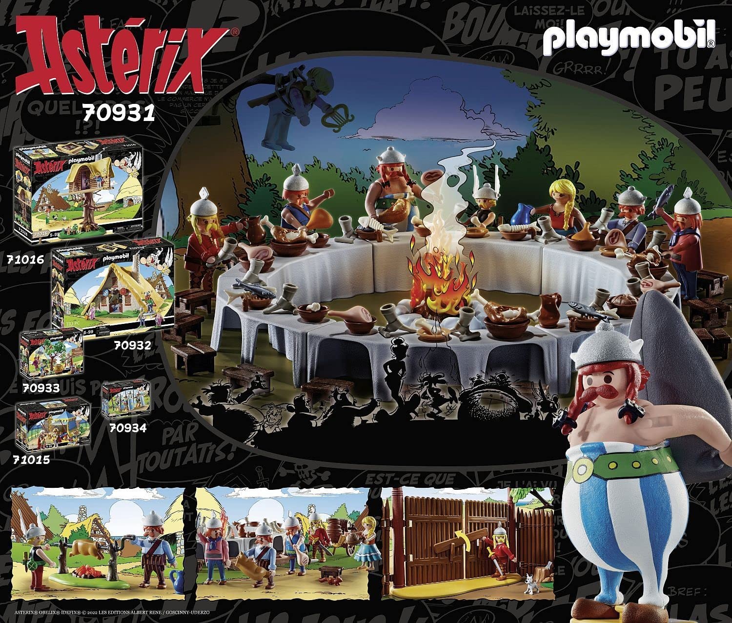 - Asterix, Obelix con piastra di supporto, girarrosto, capanna di Asterix, banchetto con 6 tavoli e spazio sufficiente per 18 commensali e molto altro ancora