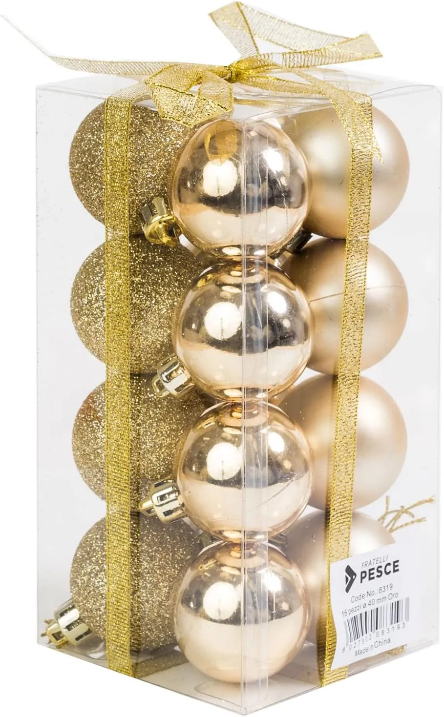 Il prodotto 8319 PAL 16PC da 40MM Oro è un set di 16 eleganti palline natalizie dal diametro di 40 mm, perfette per decorare alberi di Natale di piccole e medie dimensioni. Le sfere sono proposte in tre finiture diverse – opache, lucide e glitterate – che creano un raffinato gioco di riflessi e contrasti.