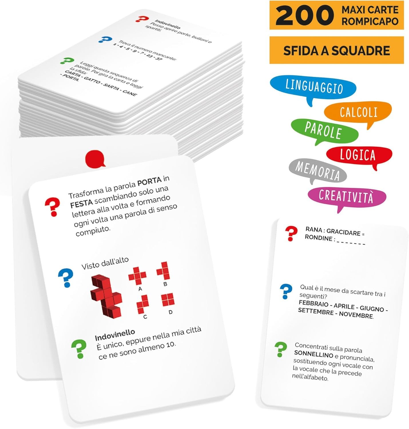 Il gioco stimola diverse intelligenze (logica, linguistica, visiva, memoria, creatività) grazie a 200 maxi carte-sfida, 20 tessere anagrammi, lavagnette, gettoni, coccarde, tabellone circolare, dado e pedone in legno. I partecipanti si dividono in squadre e affrontano prove di abilità, domande e giochi di parole. Ogni carta attiva un’intelligenza diversa, rendendo ogni manche unica e stimolante. Vince la squadra che conquista 3 manche.