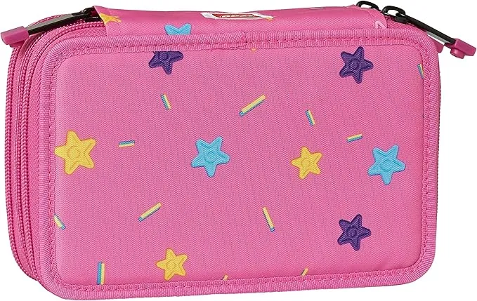 Dotato di tre ampie cerniere, offre spazi ben organizzati e facilmente accessibili, già forniti di penne, matite, colori e accessori di cancelleria indispensabili per la scuola. La struttura compatta ma capiente garantisce ordine e praticità, accompagnando i ragazzi nelle attività quotidiane.