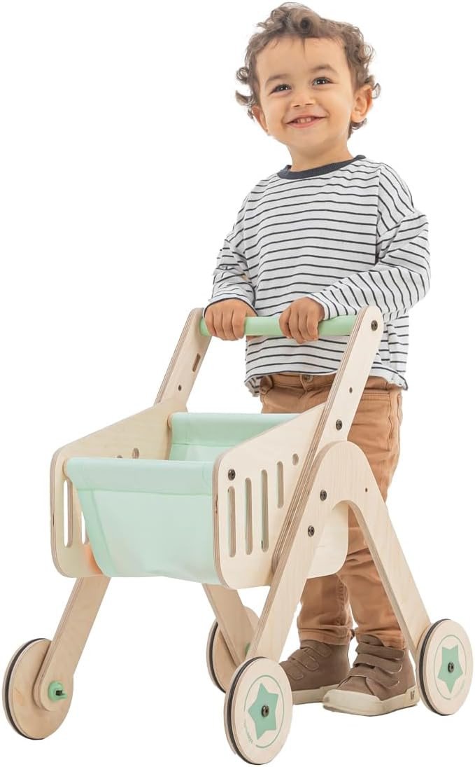 Carrello Primi Passi – Trio Shopper Menta Un elegante carrello in legno multistrato di betulla naturale, pensato per accompagnare i bambini dai 10 mesi in su nei loro primi passi. La struttura stabile e la regolazione della velocità delle ruote garantiscono sicurezza e controllo durante l’apprendimento. La forma da carrello della spesa stimola il gioco simbolico e l’immaginazione, mentre gli spigoli arrotondati e l’assenza di sostanze chimiche assicurano un’esperienza di gioco sicura e sostenibile. Il design in legno e menta lo rende un complemento raffinato per ogni ambiente.