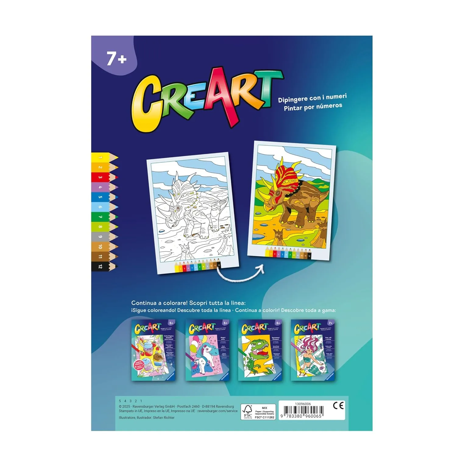 CreArt: Dinosauri (RIT) è un set creativo Ravensburger pensato per bambini dai 7 anni in su, che consente di dipingere con i numeri in modo semplice e divertente.