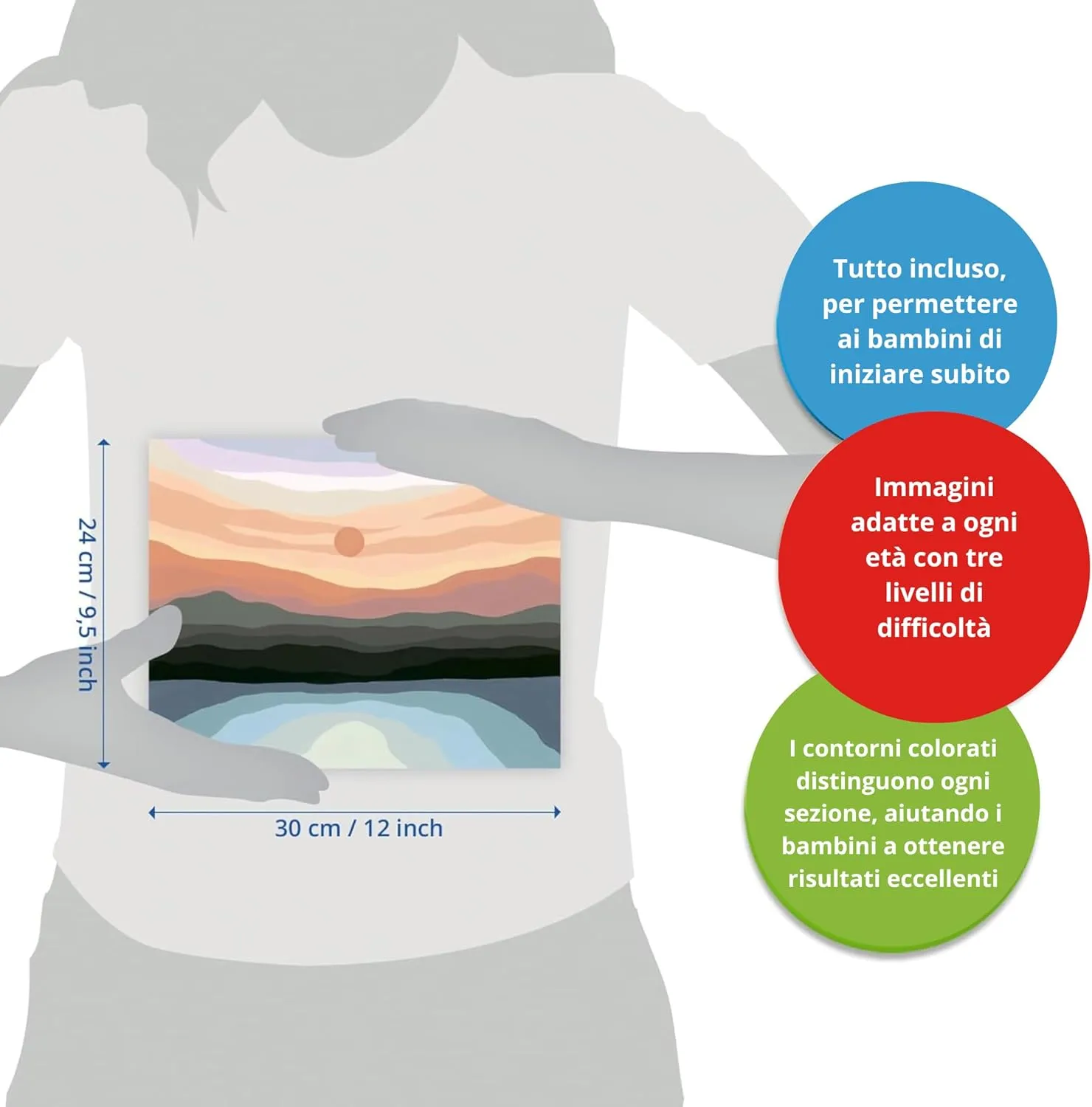 Il set permette di realizzare un dipinto geometrico e stilizzato raffigurante un paesaggio minimalista, caratterizzato da forme semplici e colori armoniosi. Include una tavola prestampata 24×30 cm con aree numerate, vernici acriliche opache e coprenti già pronte all’uso, un pennello ergonomico a doppia punta per dettagli e superfici più ampie, oltre a una tavolozza porta colori. Grazie al sistema “dipingi con i numeri”, anche chi non ha esperienza artistica può ottenere un risultato elegante e moderno, perfetto come decorazione d’interni.