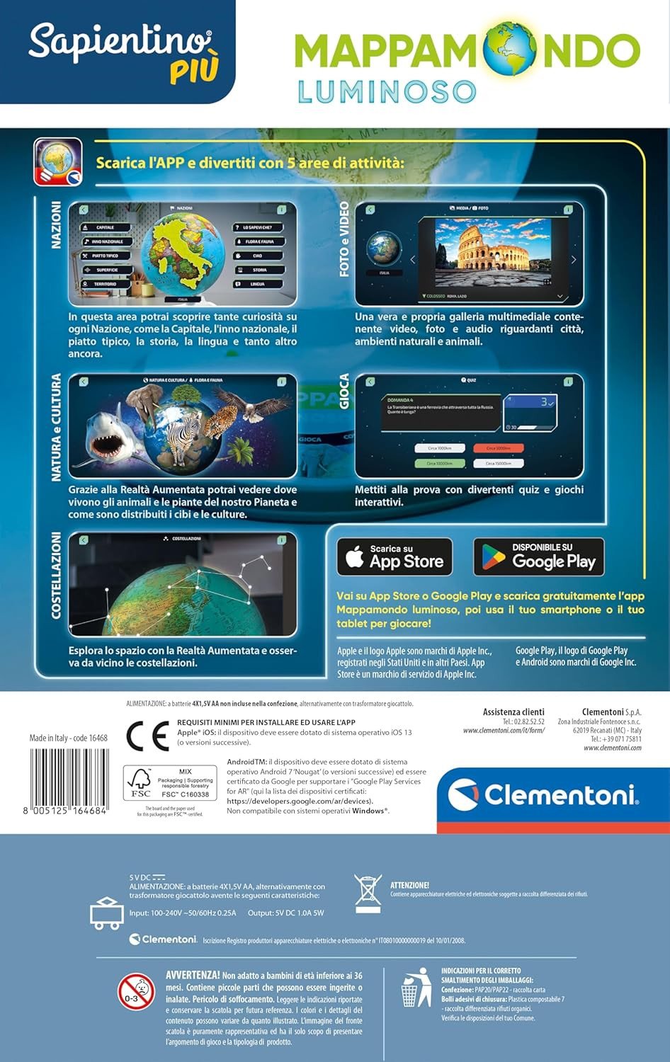 Esploramondo Luminoso – Clementoni L’Esploramondo Luminoso di Clementoni è un globo interattivo pensato per bambini dai 7 anni in su, che unisce tecnologia e apprendimento. Dotato di illuminazione LED, offre una visione chiara e coinvolgente delle nazioni, capitali e confini. Grazie alla penna digitale parlante, i bambini possono esplorare oltre 500 contenuti audio: curiosità, dati geografici, lingue, musiche e quiz. Compatibile con l’app gratuita Explora App, permette di vivere esperienze in realtà aumentata tramite smartphone o tablet. Ideale per sviluppare conoscenze geografiche e stimolare la curiosità.