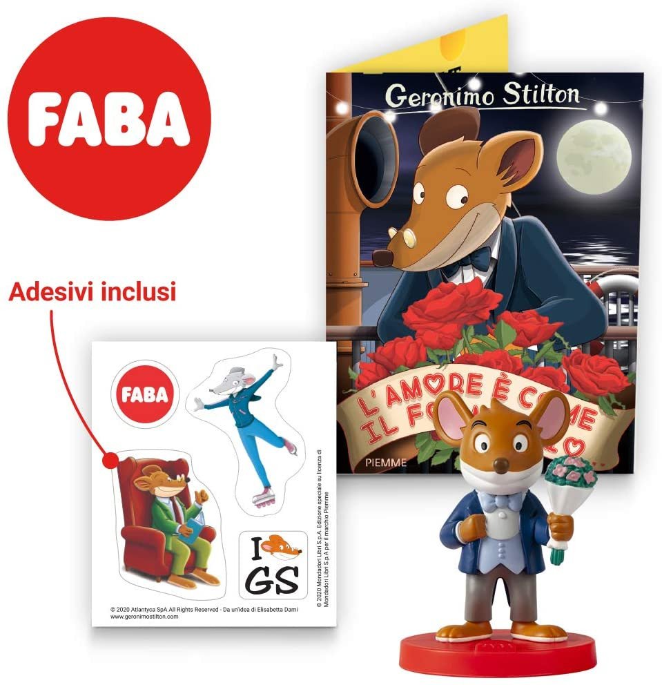 - STATUINA SONORA: da posizionare sul cantastorie Faba, il dispositivo audio che permette ai bambini di ascoltare storie, canzoni, favole e filastrocche. Ogni statuina 3D rappresenta un personaggio dell’universo dei bambini. Cassa audio non compresa.