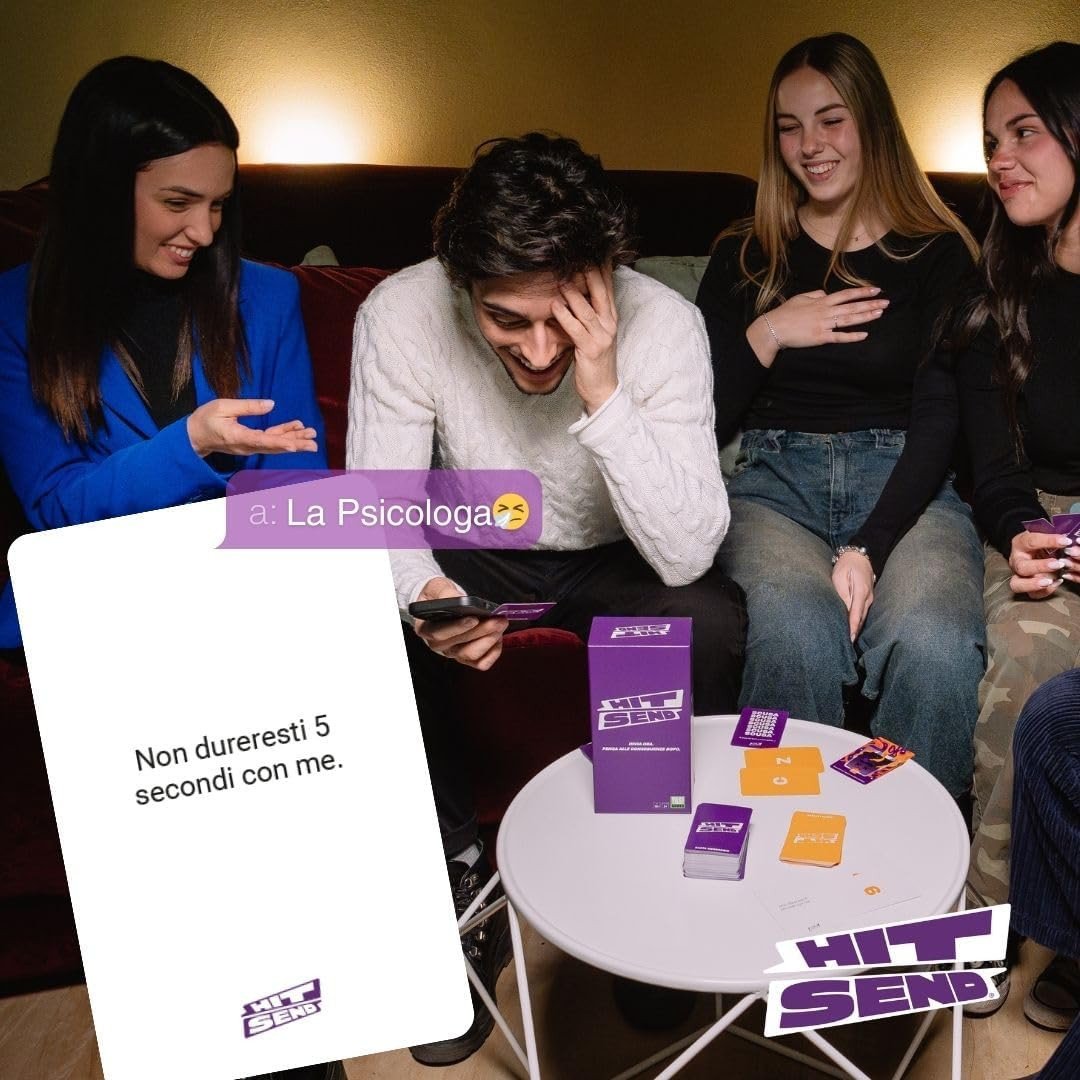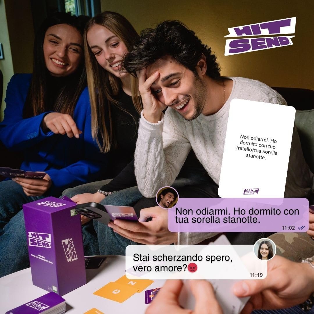 Hit Send – HS005-6 – Yas! Games – Party Game Audace per Adulti* Un gioco da tavolo provocatorio e irresistibile, perfetto per serate tra amici! Hit Send ti sfida a pescare una Carta Numero e una Carta Lettera, individuare il contatto corrispondente nella tua rubrica e scegliere (o subire) un messaggio da inviare. Il coraggio di premere “Invia” ti farà guadagnare punti, altrimenti il punto va al giocatore che ha proposto il messaggio. Include 243 Carte Messaggio, carte speciali RubriCaos e Scusa, per rendere ogni turno imprevedibile e imbarazzante. Età consigliata: 18+, da 3 giocatori in su. Un party game perfetto per chi ama osare