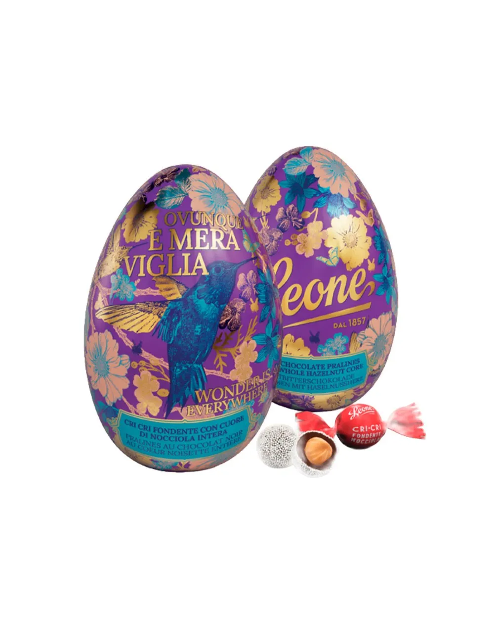 All’interno si trovano ovetti di cioccolato fondente dal gusto deciso, arricchiti dalla tipica copertura “cri cri” che aggiunge una croccantezza irresistibile. Il cuore alla nocciola completa l’esperienza con una nota morbida e aromatica, creando un equilibrio perfetto tra l’intensità del fondente e la dolcezza naturale della nocciola.