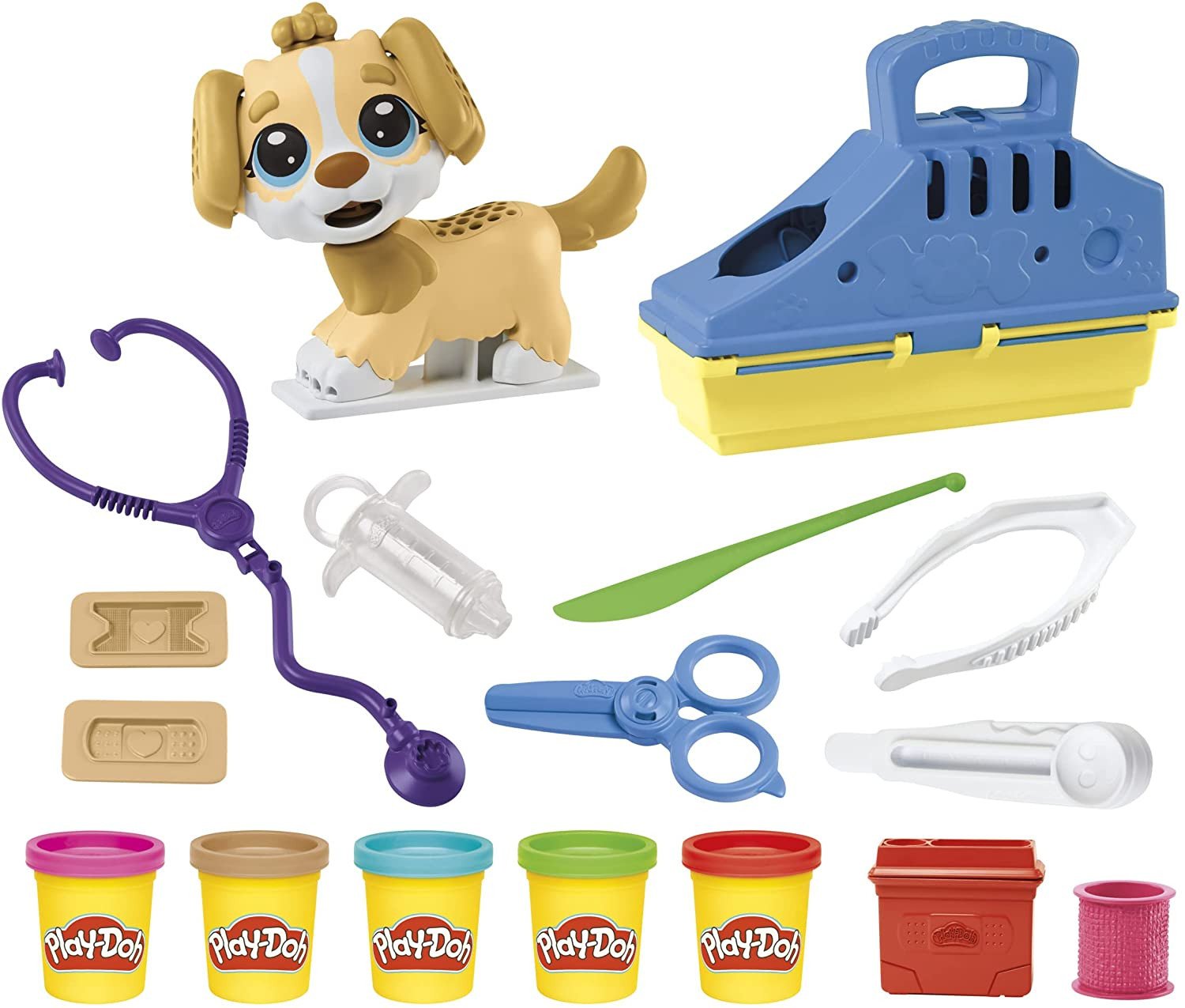 - 10 STRUMENTI PLAY-DOH A TEMA VETERINARIO: crea forme con lo stetoscopio giocattolo, riempi il termometro, realizza 5 diversi tipi di bende, taglia il pelo del cucciolo con le forbici giocattolo e tanto altro ancora