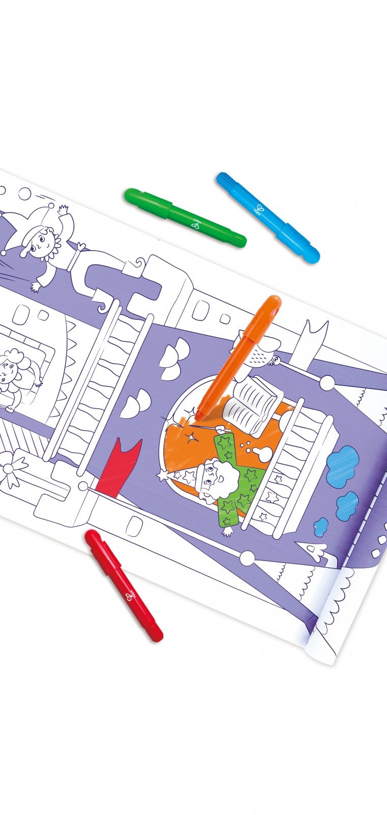 Rotolo di Carta da Disegno – Castello Un rotolo creativo lungo 5 metri con illustrazioni fiabesche a tema castello, perfetto per bambini dai 3 anni in su. Include 4 pennarelli colorati e una base adesiva che consente di ritagliare e attaccare le creazioni ovunque. Ideale per stimolare fantasia, motricità fine e gioco indipendente.