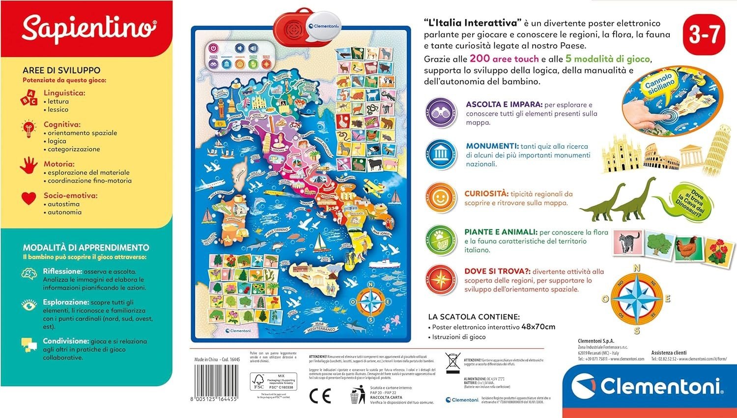 DETTAGLI: Un gioco educativo Sapientino sulla geografica dell’Italia adatto all’età prescolare, consigliato a partire dai 3 anni. Il gioco perfetto per i bambini che stanno imparando la geografia italiana.