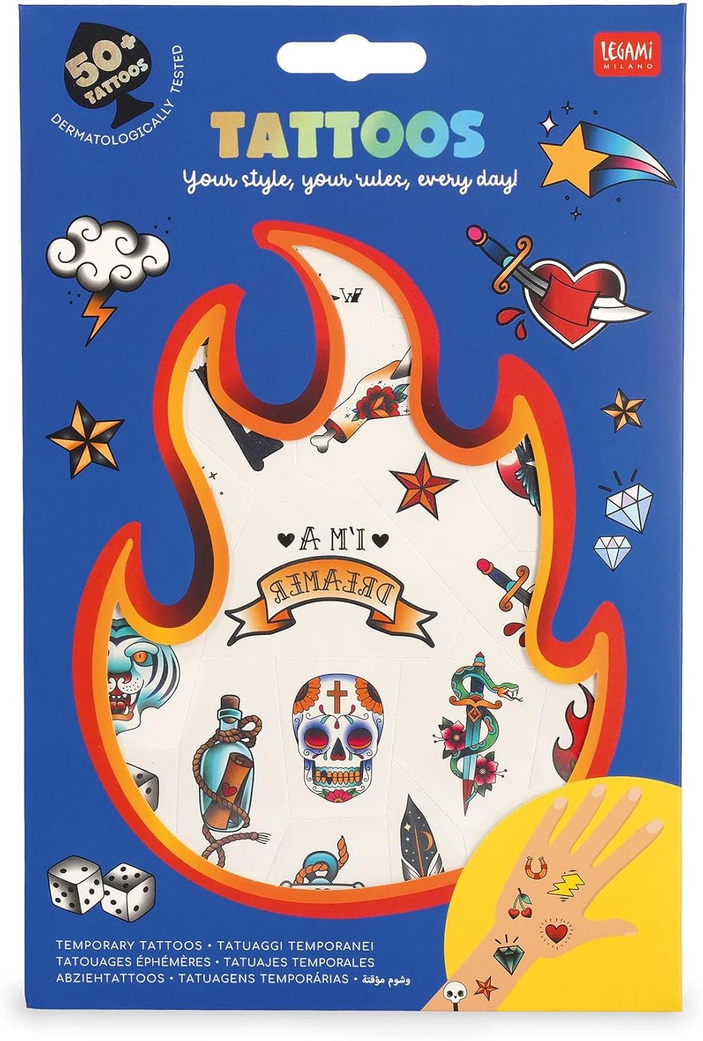 I Tatuaggi Temporanei – Tattoos Space trasformano il mondo dello spazio in un’esperienza divertente e creativa. Ogni foglio contiene una selezione di disegni colorati e dettagliati: pianeti, stelle, razzi, navicelle, alieni simpatici e astronauti pronti all’avventura. Le illustrazioni sono vivaci e accattivanti, pensate per stimolare immaginazione e gioco.