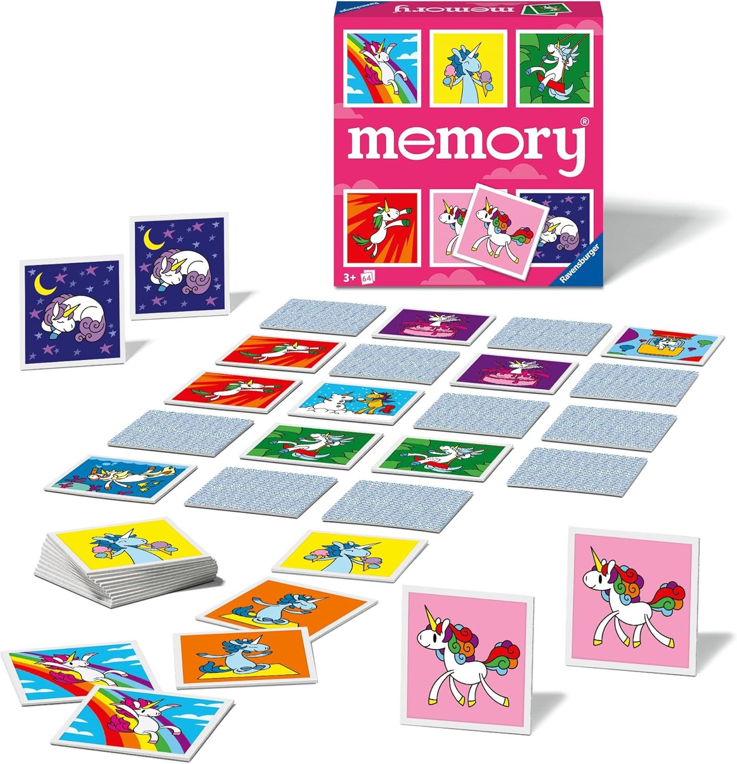 Questa versione del celebre gioco Memory® include 64 tessere (32 coppie) raffiguranti coloratissimi unicorni, ideali per 2–8 giocatori. Le carte sono realizzate in materiali resistenti e sicuri, con immagini vivaci che catturano l’attenzione dei più piccoli. Le regole semplici permettono ai bambini di giocare alla pari con gli adulti, rendendo il gioco perfetto per momenti in famiglia.